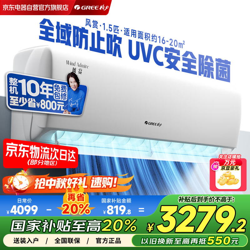 格力(GREE)空调 风赏 1.5匹一级能效变频冷暖 卧室安全除菌空调挂机KFR-35GW/NhAm1BAt 家电国家补贴