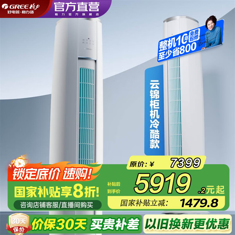 格力空调 3匹 云锦三代 国家补贴 变频冷暖 高温自清洁 智能WiFi 客厅立式空调柜机 以旧换新