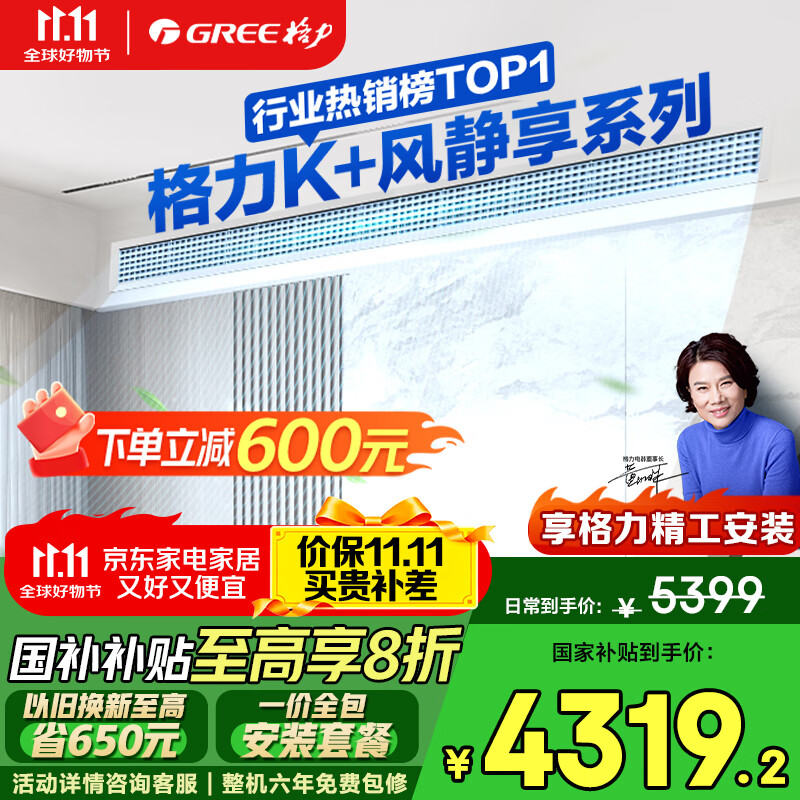【品牌直营】格力K+风静享中央空调风管机一拖一1级能效一价全包全直流变频格力精工安装小4匹一级能效