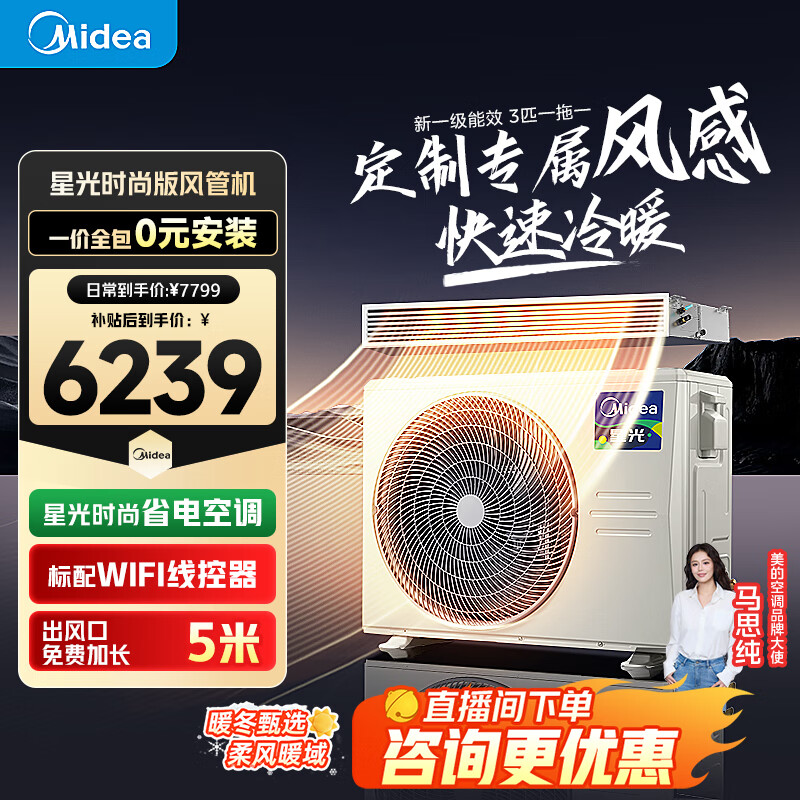 美的(Midea)风管机3匹一级能效【国家补贴直降20%】一拖一星光全屋智联 客厅隐藏式全直流变频 中央空调 3匹一级能效时尚版(32~40㎡)