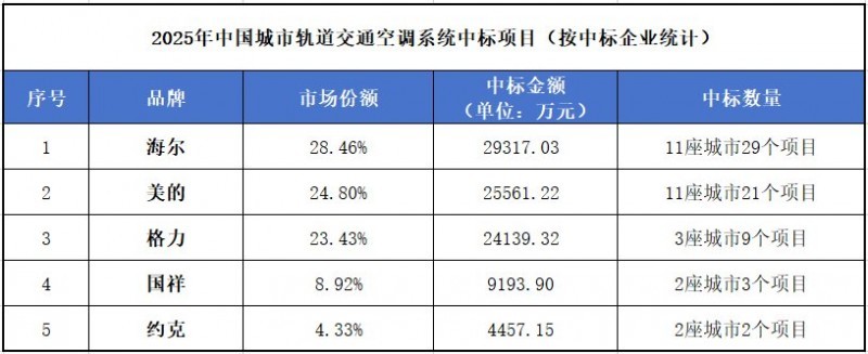1月9日,《RT轨道交通》发布了2025年中国城市轨道交通市场数据报告。数据清晰揭示了中国城轨空调市场的格局:海尔、格力、美的三大中国品牌扛起市场大梁,合计拿下了超过76%的市场份额,占据绝对主导地位。相较之下,早年曾活跃于此的外资品牌,如今却鲜少见到。