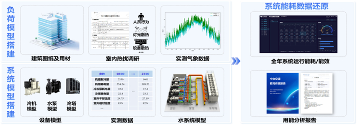 通过建筑图纸、室内热扰调研、气象参数及实测数据等信息,校核还原项目建筑负荷及系统能耗,输出改造前全年用能分析报告,评估系统节能潜力。