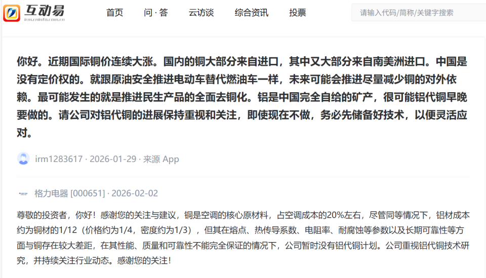 2月2日晚,格力电器在互动平台表示,在铝性能、质量和可靠性不能完全保证的情况下,公司暂时没有铝代铜计划。