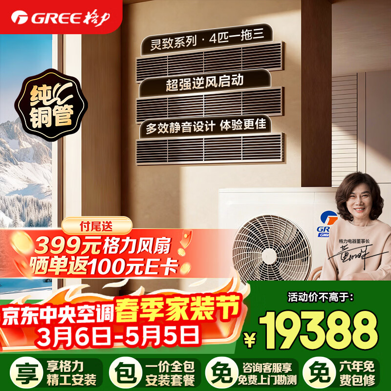 【京东自营】格力中央空调灵致多联机4匹一拖三纯铜管GMV-EH4WL/A两室一厅多效静音一价全包精工